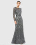 Indulge in timeless elegance with this long sleeve embellished gown, featuring exquisite beading, sheer illusion sleeves, and a flattering hand-beaded belt. Perfect for black-tie galas and evening events, this gown embodies glamour and sophistication.